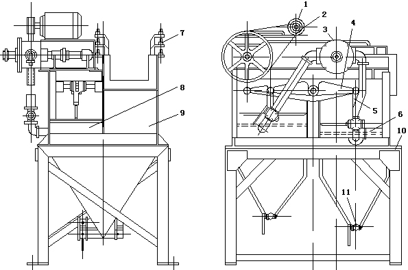 1-電動機; 2-傳動部分; 3-分水器; 4-搖臂; 5-連桿; 6-膠隔膜; 7-跳汰室;8-隔膜室; 9-跳汰室; 10-機架; 11-排礦活栓