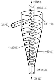 水力旋流器的構造:上部為圓錐形。在圓柱形筒體上裝有與筒壁呈切線方向的給礦管。圓錐上部裝有與圓柱部分相連通的中心溢流管。溢流管的上端則通過緩沖室或直接與外部管道聯接以排出溢流。在圓錐形底部裝有沉砂咀,以排出粗粒沉砂。為了減不磨損,可在給礦口、沉砂咀及筒體內壁襯以耐磨橡膠或用輝綠巖、鑄石、碳化硅等耐磨材料。